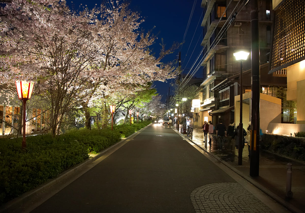 Kiyamachi Street, once on the eastern edge of Kyoto, runs between the Kamo River and the Takase River canal. In spring, cherry blossoms line the banks; in summer, fireflies light the air. Built in the early Edo period to transport timber, the Takase River helped the area thrive into a lively district of inns, restaurants, and sake shops.