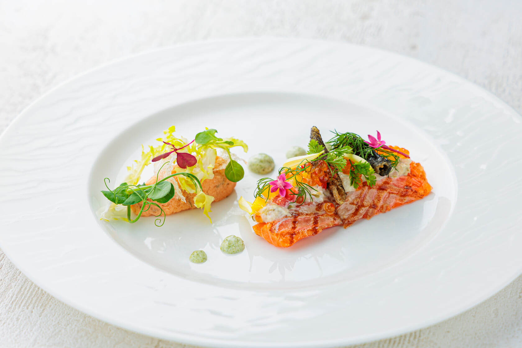 【前菜】桜鱒の瞬間グリエ 西洋山葵ラヴィゴット サーモンキャビアと共に