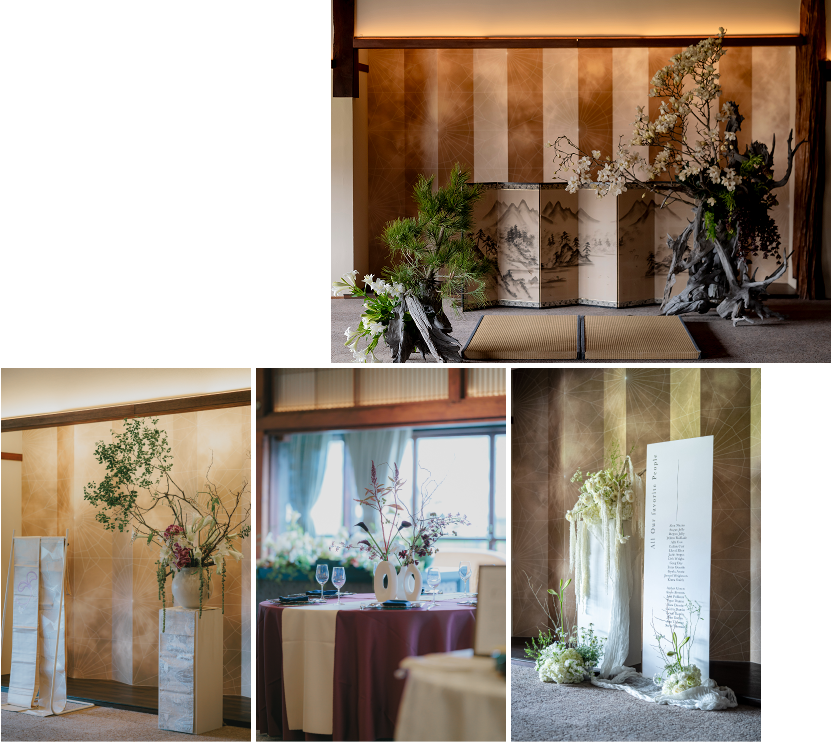 生け花スタイルの卓上装花、盆栽や松を使ったダイナミックな空間演出、
