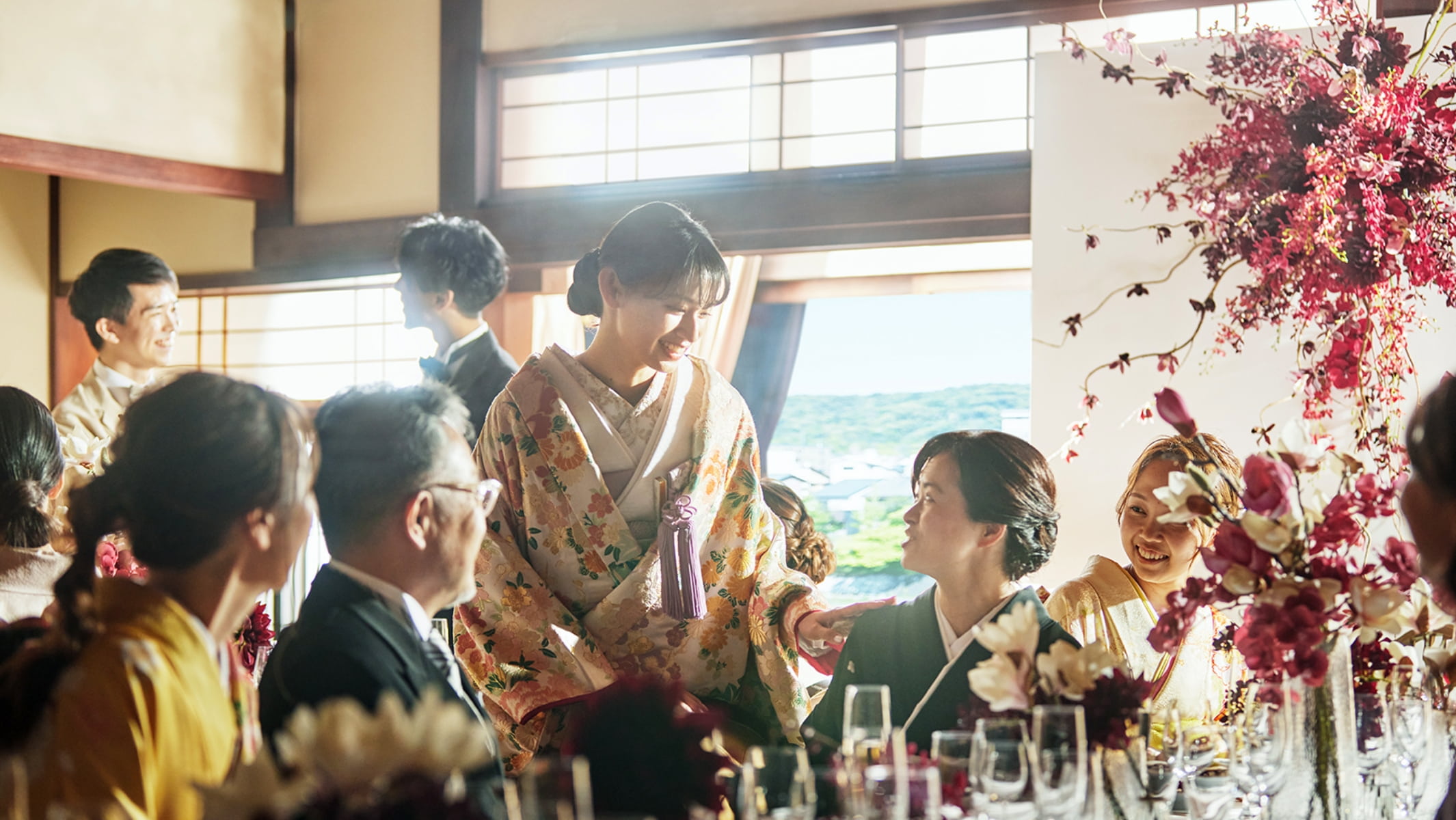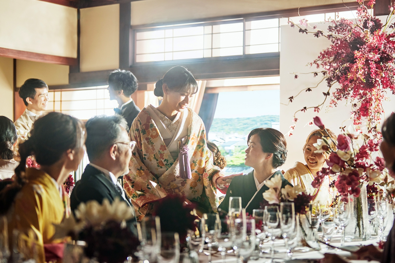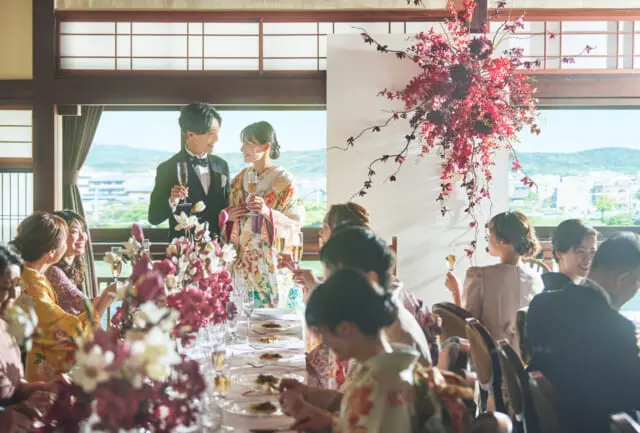 和装で挙げる結婚式をイメージされていた新郎様新婦様。その和装に似合う披露宴会場としてお選びくださったのが、FUNATSURUでした。古都の美意識が息づく空間は、和装と洋装どちらにもマッチ。さらに遠方から…