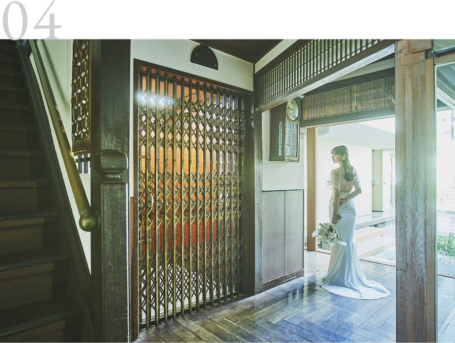 文化財建築が醸す品格と、各所に残る歴史ある設えが大切なゲストをお出迎え。少人数ウエディングで気にされる方が多い「会話が弾むかどうか」FUNATSURUはおもてなしのために建てられた元料亭旅館だからこそ、自然と会話が弾む設えが施されています。